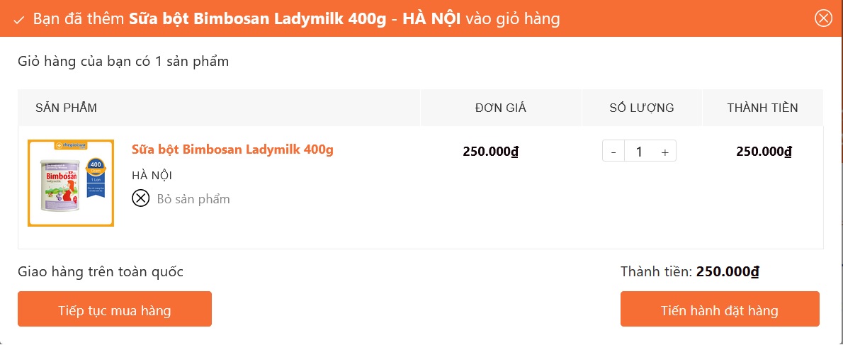 Bước 3: Chọn “Tiến hành đặt hàng” nếu đã chọn đủ sản phẩm ưng ý hoặc “Tiếp tục mua hàng” nếu vẫn còn sản phẩm chưa cho vào giỏ.